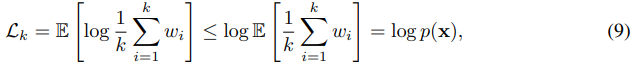 This is a lower bound on the marginal log-likelihood, as follows from Jensen’s Inequality and the fact that the average importance weights are an unbiased estimator of p(x):