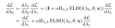 Following past work, this backpropagation step can be done efficiently with fast Hessian-vector products (LeCun et al., 1993; Pearlmutter, 1994). In particular, consider the case where we perform one step of refinement, λ1 = λ0 + α∇λ ELBO(λ0, θ, x), and for brevity let L = ELBO(λ1, θ, x). To backpropagate through this, we receive the derivative dL / dλ1 and use the chain rule,