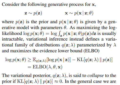 and therefore the model is non-identifiable (i.e. it does not have to utilize the latent variable). However in finite data regimes we might still expect a model that makes use of its latent variable to generalize better due to potentially better inductive bias (from the latent variable). Training generative models that both model the underlying data well and learn good latent representations is an important avenue for future work.
