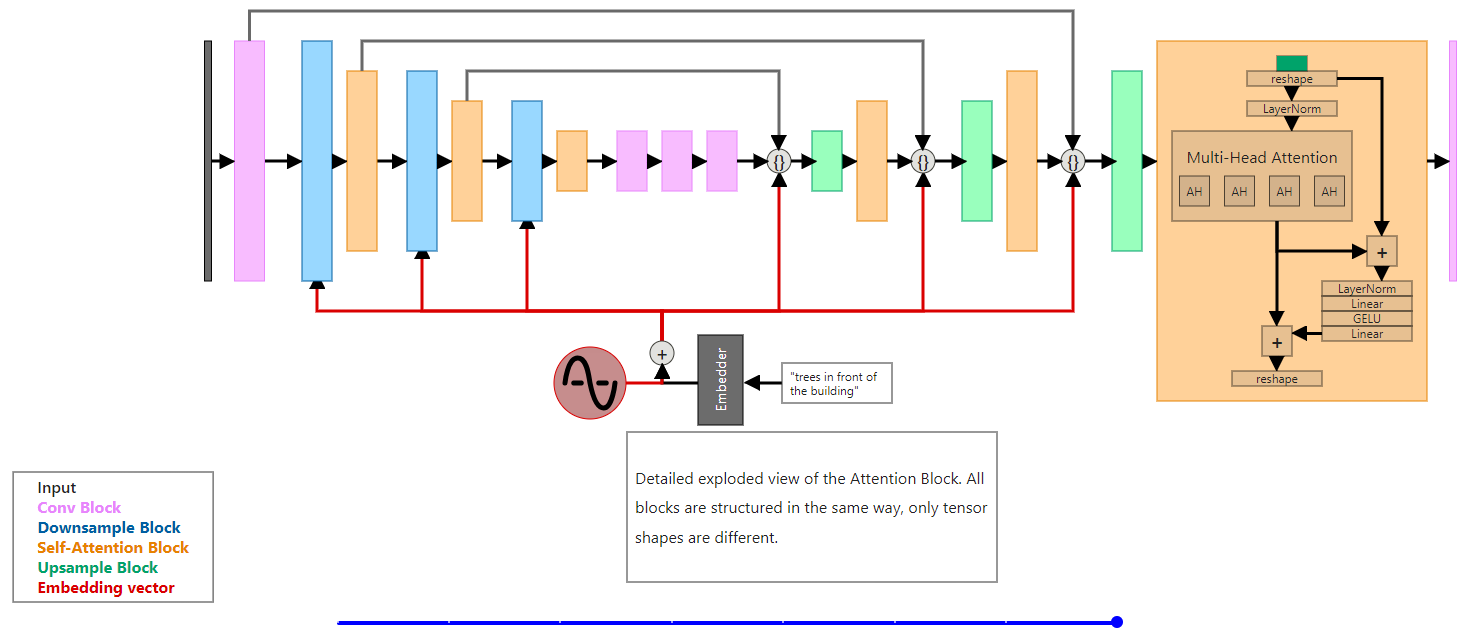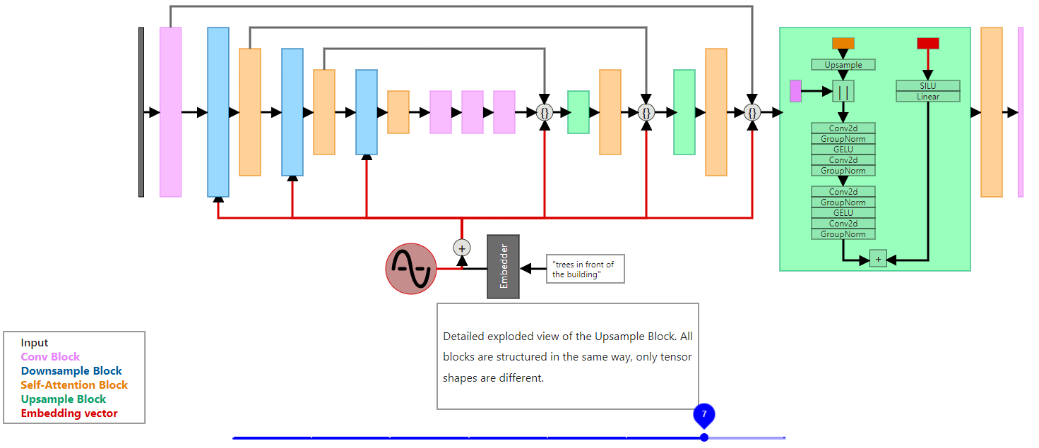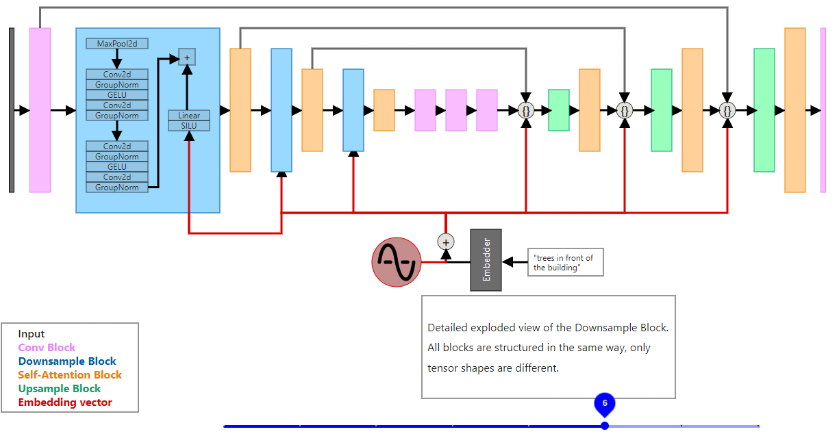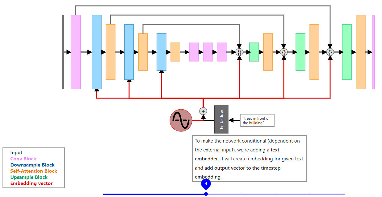 Before we get to the architecture of individual blocks, we should discuss how the information about timestep and prompt is passed to the network. If you look at Fig. 8, it shows as if the diffusion model just processes the input image with noise. This isn’t true, each step in the process adds embedding with information about the current timestep and prompt (if the model supports prompting, first diffusion models weren’t). To do that, we need to use sinusoidal encoding for encoding timestep t, and some kind of embedder for our prompt. I’ve described how this type of encoding works in my article about positional encoding in transformers.
