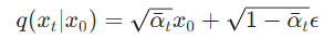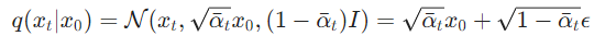 As you can imagine, adding noise to the image using a forward diffusion process is going to be slow. The training process doesn’t use examples in line with the forward process but rather it uses samples from arbitrary timestep t. This means at each training step we would need to iterate through t steps to generate 1 training sample. But 2020 paper has the solution, but first, we have to define the entire noise to be added at T as: