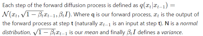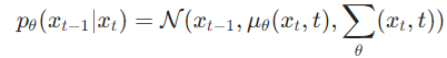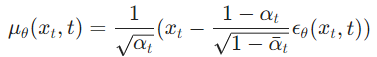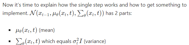 The Authors of the 2020 paper decided to set the second part to be time-dependent but not trainable. It’s not set to be constant but rather set to equal . This is the same beta from the schedule before. Now the only thing that is left is the first part (mean). Described the hard math of the reverse process blogpost (also check Appendix A in the 2020 paper [2]). What we need to know from all of this is that