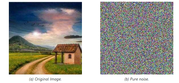 Figure 1: Input and output of the forward diffusion process If we take any image (Fig. 1a), it has some none-random distribution. We don’t know the distribution, but our goal is to destroy it so we can do it by adding a noise to it. At the end of that process, we should end up with noise similar to pure noise.