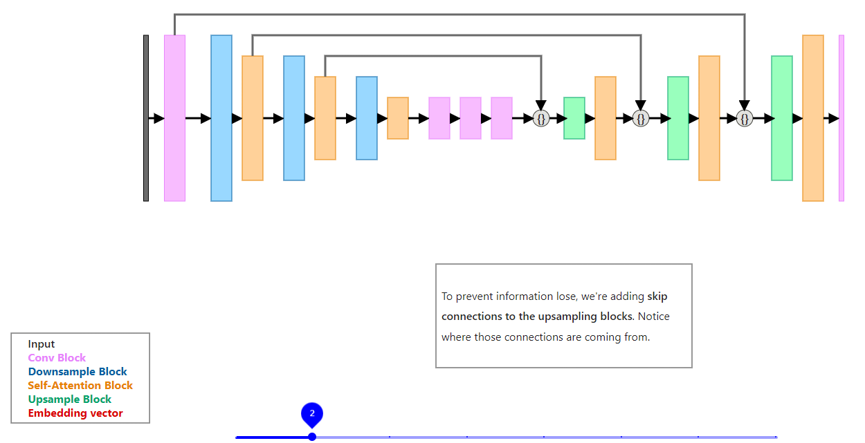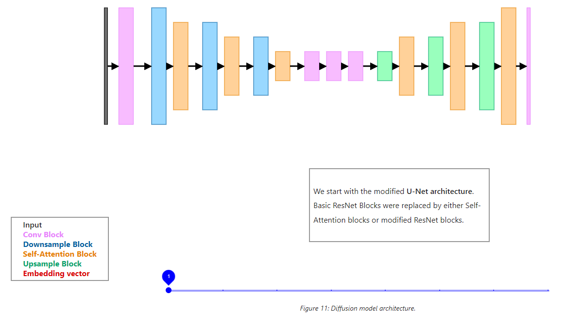 - Diffusion model uses a modified U-Net architecture