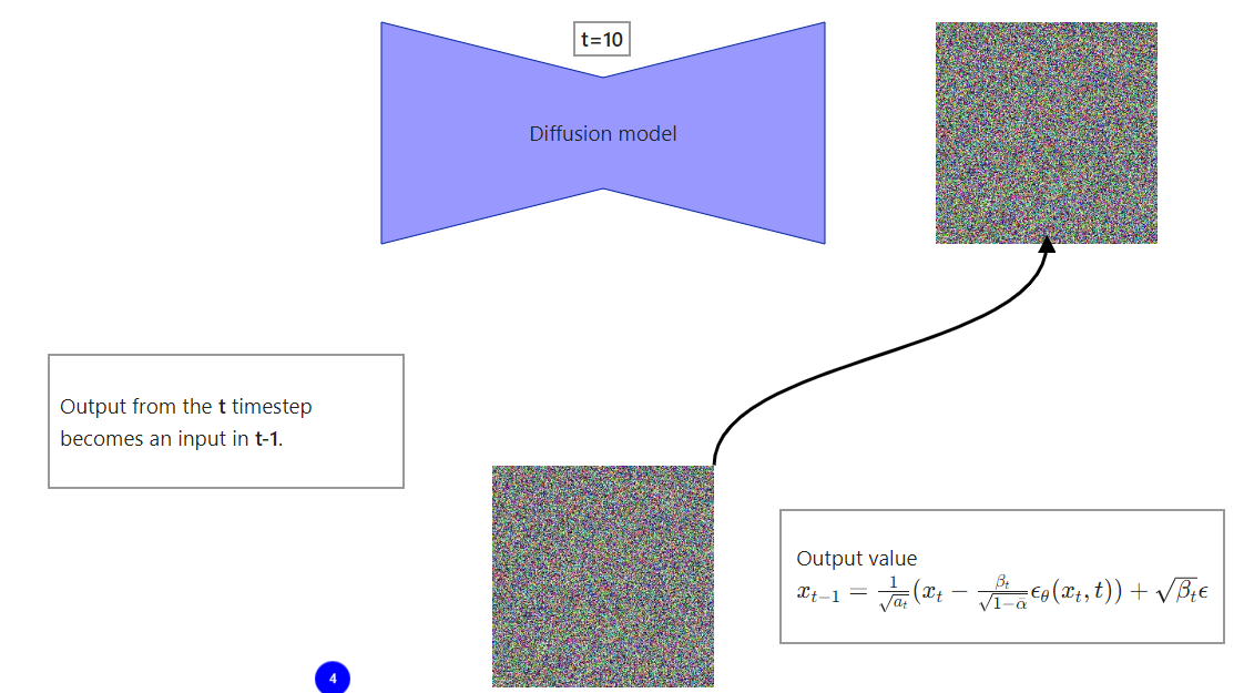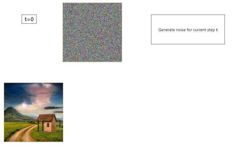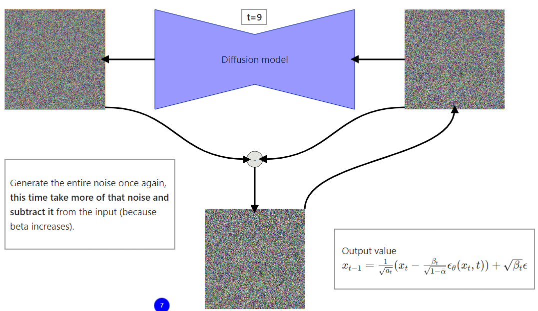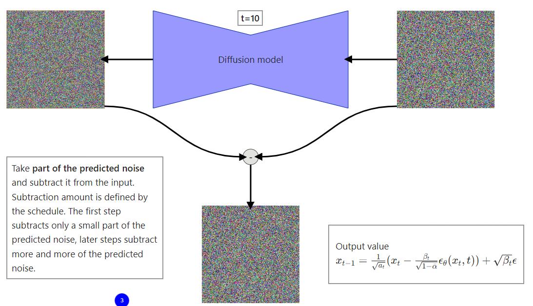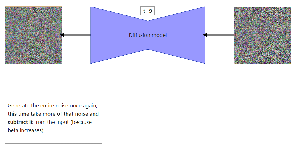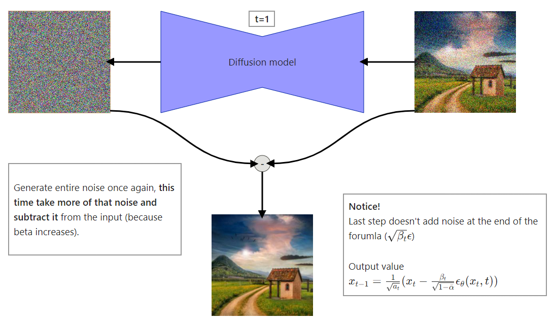 Figure 8: High level visualization of one step from the reverse diffusion process. Because of that, a lot of people think that a neural network (called diffusion model for even more confusion) is removing noise from an input image or predicting the noise to be removed from an input. Both are incorrect. Diffusion model predicts the entire noise to be removed in a given timestep. This means that if we have timestep t=600 then our Diffusion model tries to predict the entire noise on which removal we should get to t=0, not t=599. I’ll explain everything in a second but first, just look at the step by step reverse diffusion process.