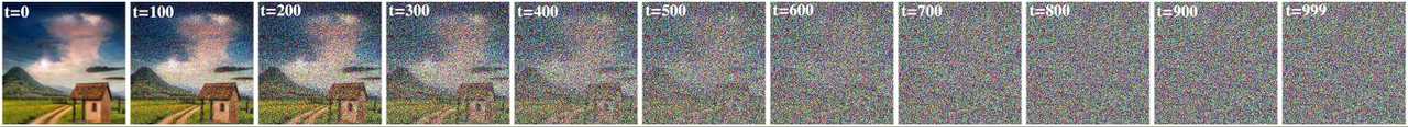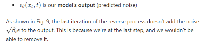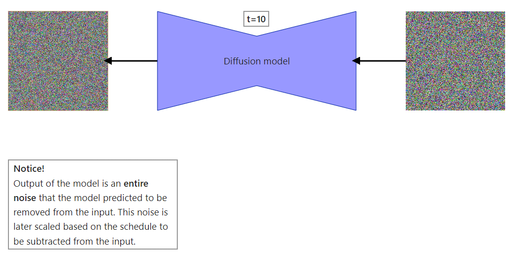 - Diffusion model predicts the entire noise, not the difference between step t and t-1