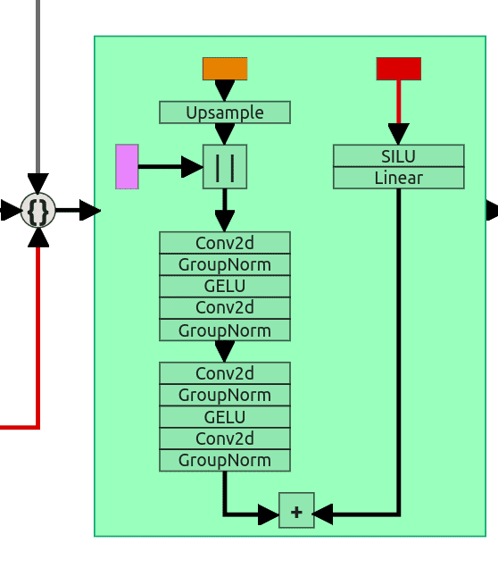 3rd input is (the same as in the downsample block again) sent through SILU and Linear layer and later added to the result from the 2nd ResNet block.