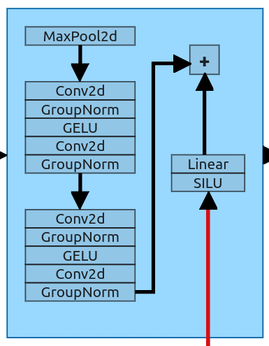 Figure 13: Downsample block Downsample block is the first block that receives not only data from the previous layer but also data about timestep and prompt. This block has 2 inputs and behaves as a standard downsample from the U-Net architecture. It gets an input and downsample it to the size of the next layer. It uses the MaxPool2d layer (kernel size 2) which halves the input size (64x64 -> 32x32). After that, we have 2 ResNet blocks (the same as the entire layer just before in Fig. 12).