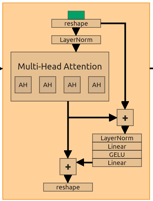 Inside the block, the authors added 2 skip connections to be combined with self-attention output. The first one adds pure reshaped input to the output from the attention layer and passes it through the forward layer (Normalization -> Linear -> GELU -> Linera). The second one gets output from that layer and adds it back to the output from the attention. In the end, we need to reverse initial reshaping of the tensor (1024, 128) -> (128, 32, 32).