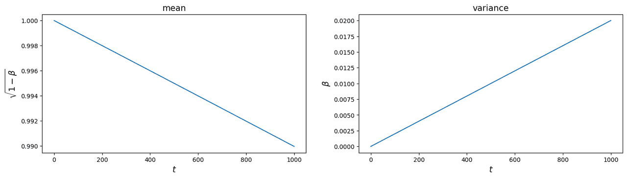 Figure 4: Change in mean and variance for a given timestep Researchers from OpenAI in their 2021 paper[3] decided that using a linear schedule is not that efficient. As you’ve seen before, most of the information from the original image is lost after around half of the total steps. They designed their own schedule and called it the cosine schedule (Fig. 5). The improvement in schedule allowed them to reduce the number of steps to 50.