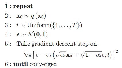 First, we sample an image from our dataset (2:). Then we sample timestep t (3:) and finally sample noise from the normal distribution (4:). As you remember, we’ve defined how to apply noise at t without going through the iterative process: