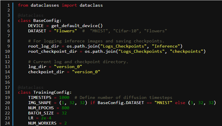First and foremost, we’ll define configuration classes that will hold the hyperparameters for loading the dataset, creating log directories, and training the model.