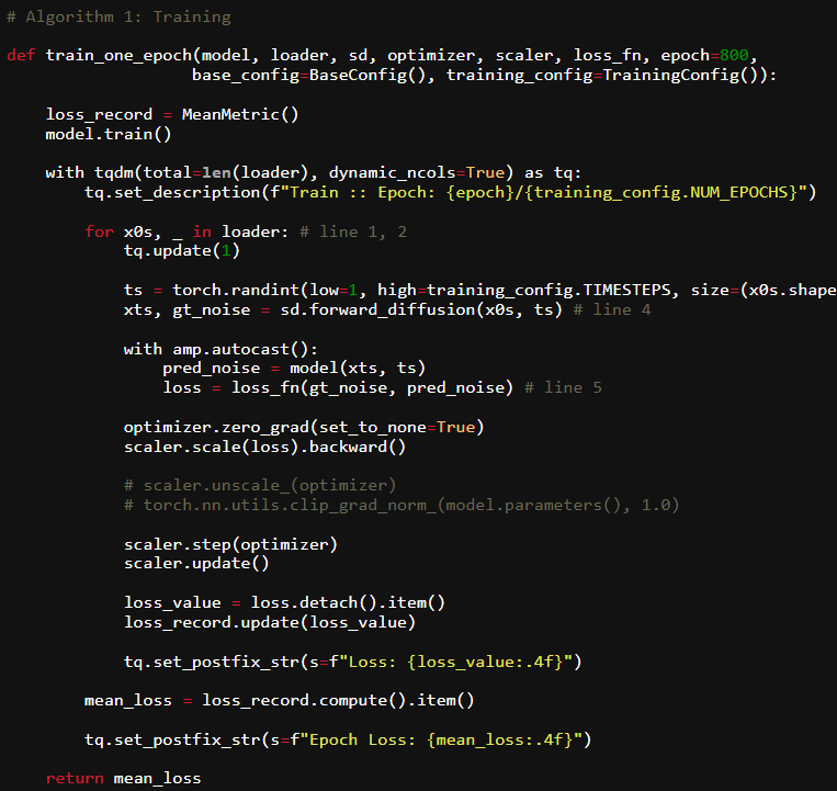 We also use Mixed-Precision training to train the model faster and save GPU memory. The code is pretty straightforward and almost a one-to-one conversion from the algorithm.