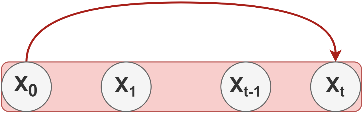 We have to follow through all t-1 intermediate states in Markov Chain to get xt To fix this, the authors of the DDPM reformulated the kernel to directly go from timestep 0 (i.e., from the original image) to timestep t in the process.