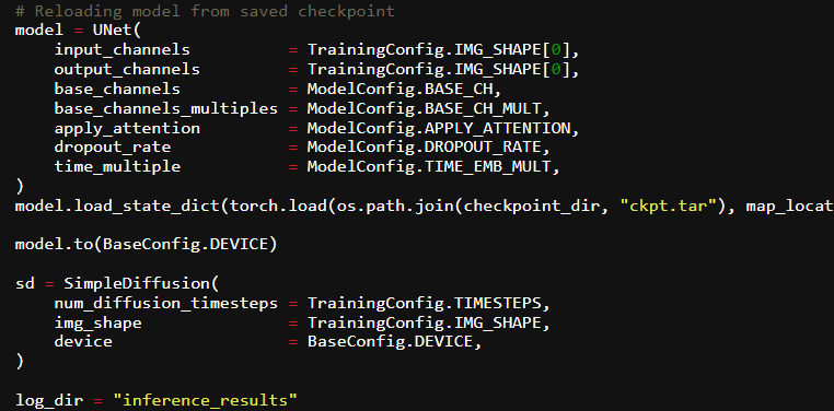 To perform the inference, we simply have to reload the saved model, and you can use the same or a different logging directory to save the results. You can re-initialize the SimpleDiffusion class as well, but it’s not necessary.
