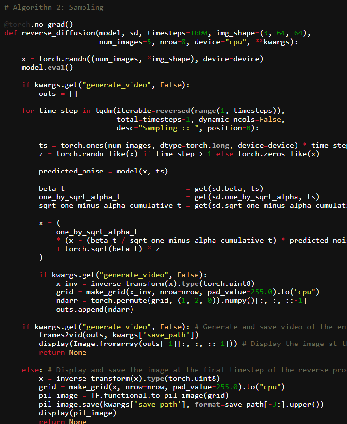 The next function we define is reverse_diffusion(...) which is responsible for performing inference i.e., generating images using the reverse diffusion process. The function takes in a trained model and the diffusion class and can either generate a video showcasing the entire diffusion process or just the final generated image.