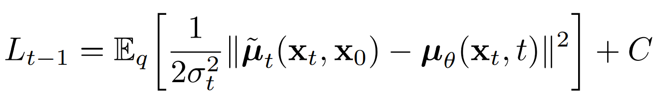 So Lt-1 is the only loss term left which is a KL divergence between the “posterior” of the forward process (conditioned on xt and the initial sample x0), and the parameterized reverse diffusion process. Both terms are gaussian distributions as well.