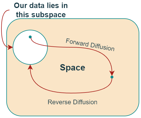A high-level conceptual overview of the entire image space. - In the “Reverse Diffusion process,” the idea is to reverse the forward diffusion process.