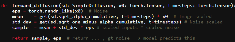 The forward_diffusion(...) function takes in a batch of images and corresponding timesteps and adds noise/corrupts the input images using the updated forward diffusion kernel equation