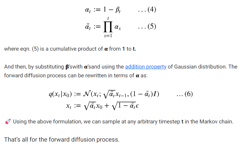 Referring to the second equation, we can easily sample image xt from a normal distribution as: