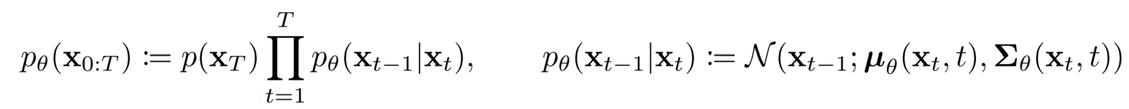 - The reverse process is also a Markov chain where a neural network predicts the parameters for the reverse diffusion kernel at each timestep.