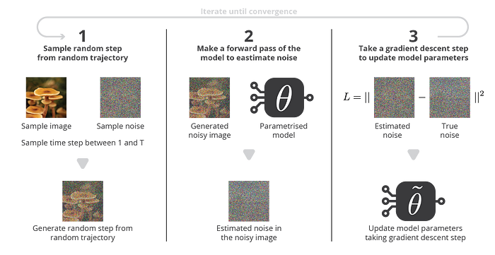 At the end of the day, we are left with this very neat loss function to be optimised. The neural network modelling the noise can take almost any shape depending on the nature of the data. In the case of images, many papers use convolution and attention blocks organised in a U-Net shape, but other architectures could also fit. Then the training simply consists in iteratively sampling some triplets (initial data, step, noise) and applying a gradient descent step with respect to the loss function.