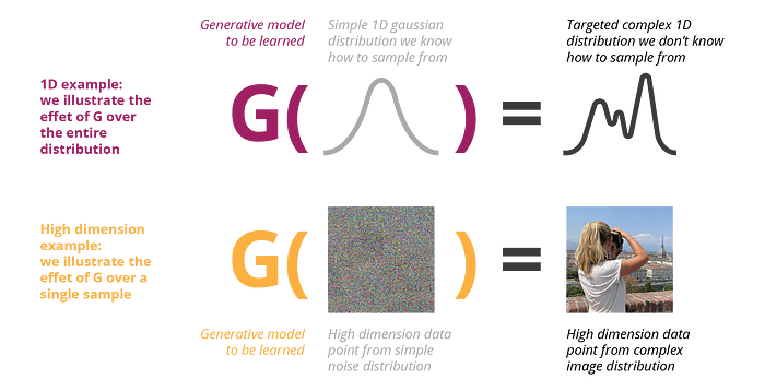 - learning a function (represented by a neural network) that takes some gaussian noise and output data from a targeted complex distribution can be a pretty difficult task