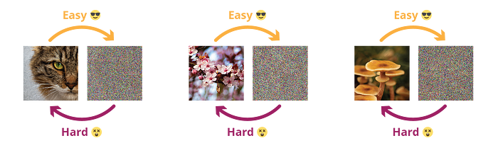 As we mentioned, it is pretty easy to randomly project any given image to an isotropic gaussian noise. On the contrary, reversing the process is very difficult: looking at some given noise we can’t say much from the prior image as there is no structure to rely on.