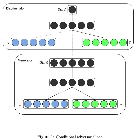 Generative adversarial nets can be extended to a conditional model if both the generator and discriminator are conditioned on some extra information y. y could be any kind of auxiliary information, such as class labels or data from other modalities. We can perform the conditioning by feeding y into the both the discriminator and generator as additional input layer.