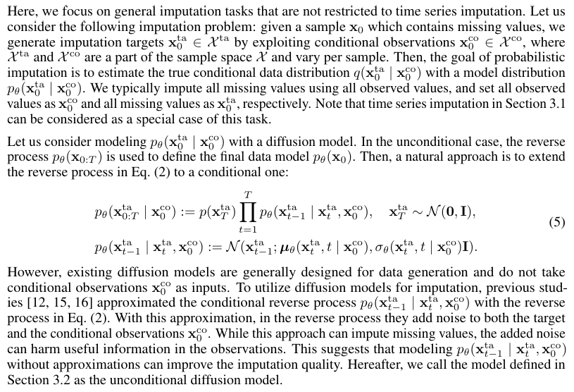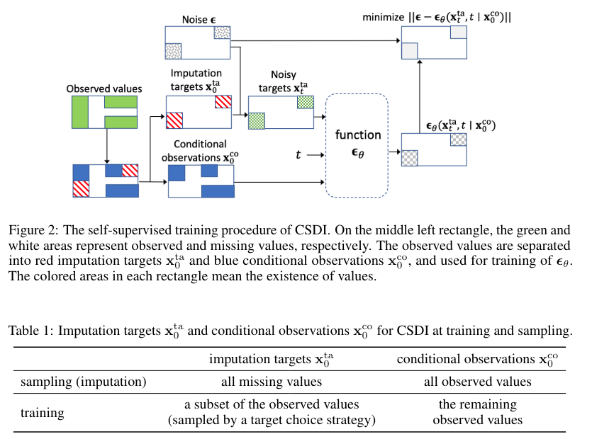 - We propose conditional score-based diffusion models for probabilistic imputation (CSDI), and implement CSDI for time series imputation. To train the conditional diffusion model, we develop a self-supervised training method.