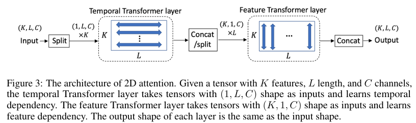 Attention mechanism To capture temporal and feature dependencies of multivariate time series, we utilize a two dimensional attention mechanism in each residual layer instead of a convolution architecture. As shown in Figure 3, we introduce temporal Transformer layer and a feature Transformer layer, which are 1-layer Transformer encoders. The temporal Transformer layer takes tensors for each feature as inputs to learn temporal dependency, whereas the feature Transformer layer takes tensors for each time point as inputs to learn feature dependency.
