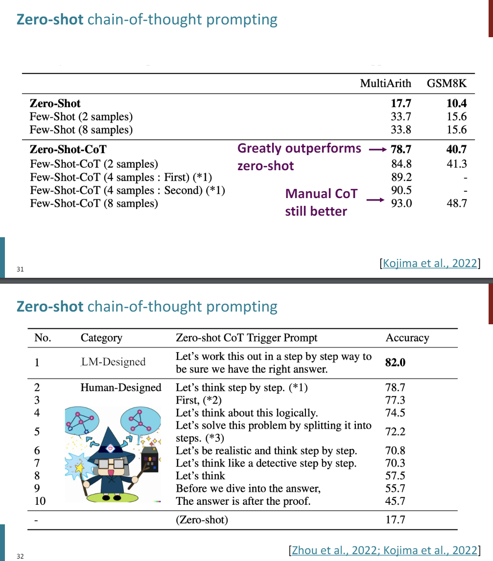They tried out a bunch of different prefixes, the answers after the proof, let's think about this logically. And they fould that let's think step by step was the best one. It turns out, this was actually built upon-- later in the year, where they actually used a language model to search through the best possible strings that would maximize performance on this task, which is probably like gross overfitting, but the best prompt they found was let's work this out step by step in a step by step way to be sure that we have the right answer.
