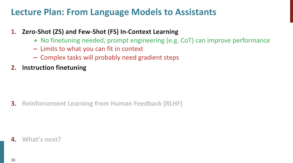 That was instruction finetuning. Positives of this method, super simple, super straightforward, it's just doing finetuning. And this really cool ability to generalize to unseen tasks.