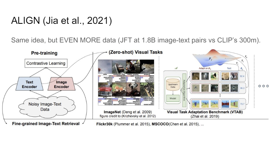 So very quickly after CLIP, there was this paper from Google using ALIGN. It's the same idea, but then you just keep throwing more data and more compute at it and that often works much better. So that's what they found here, too.