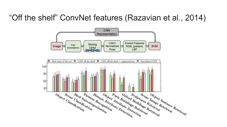 This probably feels super obvious now, but in 2014 when people were starting to discover this, it was really very surprising that you could just use off-the-shelf ConvNet features to really replace the entire computer vision pipeline. So people used to do all of this very fancy sophisticated stuff and people spent decades on trying to refine this and then it was all thrown away and replaced by a ConvNet that does all of that stuff for free.