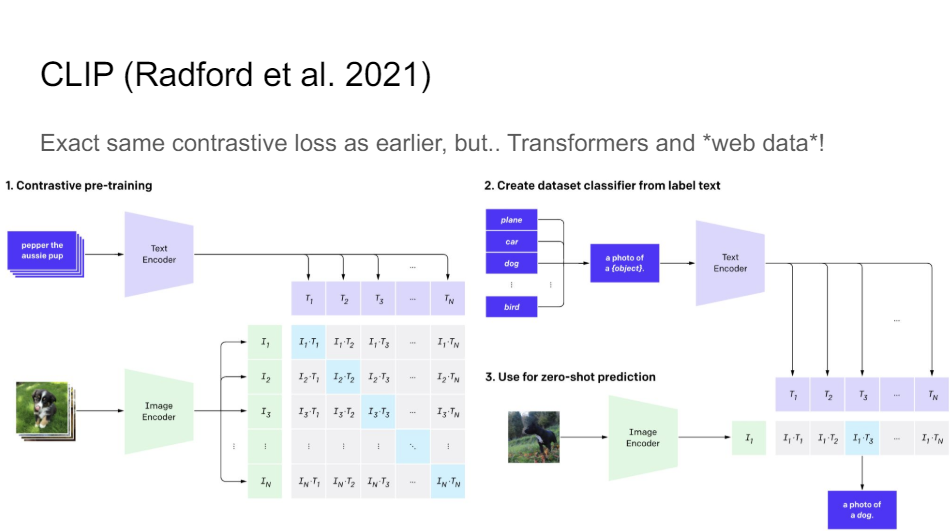The most famous instance of that these days is CLIP. So CLIP from OpenAI. So it's again, exactly the same contrastive loss that we've seen, all these early approaches. It does negative sampling but then in batch. So you just have a batch. You have two things that are aligned. So like this is the first piece of text and the first image, they are aligned. So this is the right answer. And I just want to make sure that I rank this thing higher than all the alternatives. So it's a very simple idea.