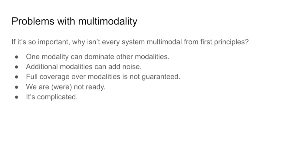 If all of this multimodal stuff is cool and useful and doesn't look that difficult, why aren't we all doing multimodal things? So why do we focus on specific modalities?