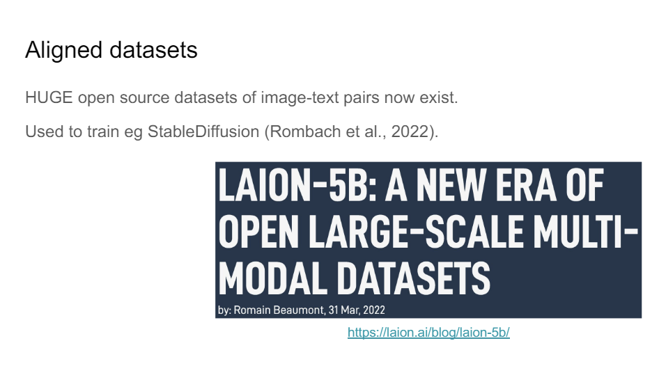 And what is really cool, I think, is that there's this organization called LAION, where they've started this open-source collective to create really high-quality datasets. And so the LAION, the initial dataset, was-- how many examples in the initial LAION? 400 million. So now there's a much bigger version of LAION that's even multilingual and it has 5 billion examples.