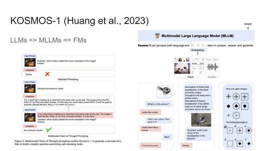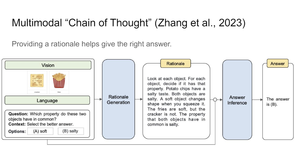 You've probably heard of chain of thought prompting and things like that where you ask the language model like let's think step by step. And you can tell a vision and language model, generate a rationale for why something might be the case. So you generate a potential explanation for what your answer might be. And then after that, you ask it to answer the question. And it turns out that if you do that multimodal chain of thought prompting, then the system gets much better. This is the new state of the art on ScienceQA or benchmarks like that just because it learns to unpack the information.