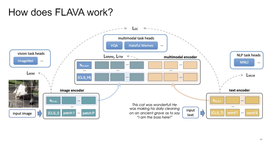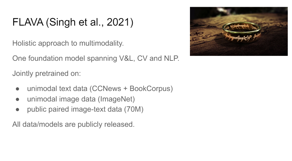 So with FLAVA, that's exactly what we try to build. We wanted to have one foundation model that is good at vision and language, and computer vision and natural language processing is jointly pretrained on all of these different data sources.