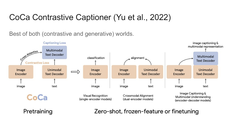 I think this is actually the current state of the art now. It's called CoCa. So a lot of these models. They all again look very similar, but in this case, now we're starting to really see these text decoders. So initially, with CLIP, I think that's also what they were trying to go for, like OpenAI being a company that really likes generative models, but they couldn't really get it to work. And I think it took us a while as a field to really figure out how to do this the right way.