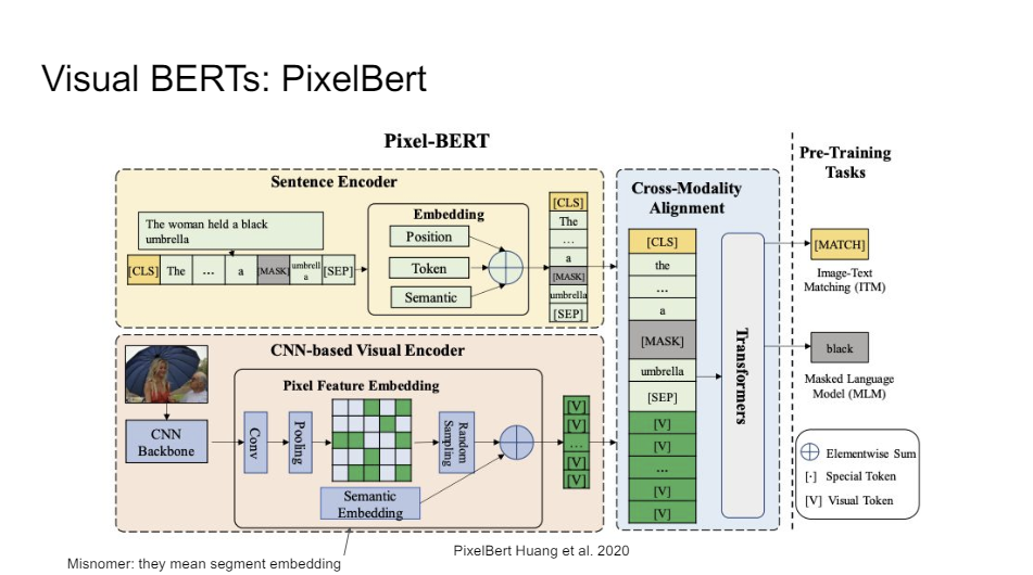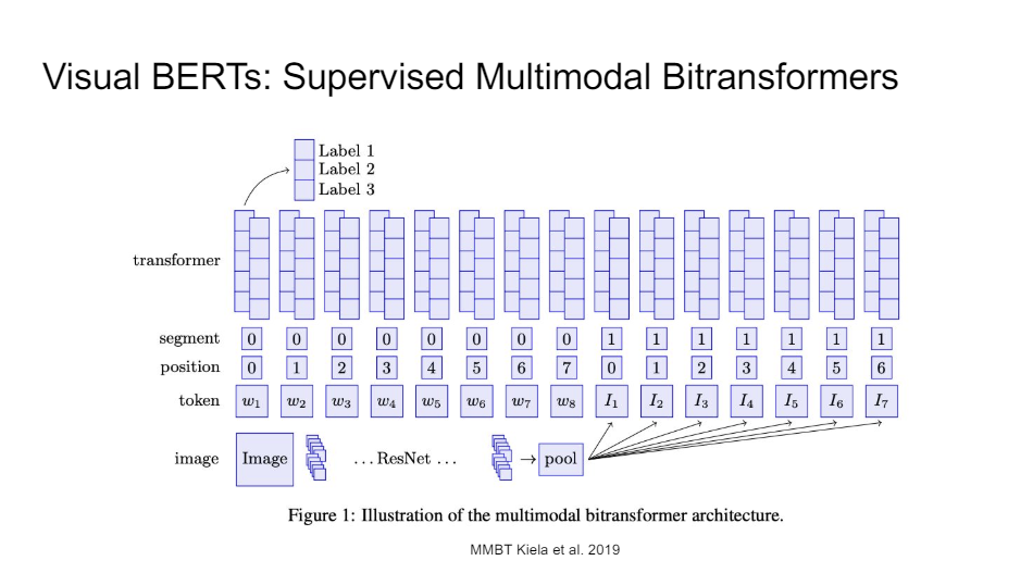 You can also just take the image itself, you put it through a ResNet, and then you do a little bit of pooling on the final feature maps and you just give those feature maps to BERT. So you then need to distinguish between your text segment embeddings and your vision segment embeddings.