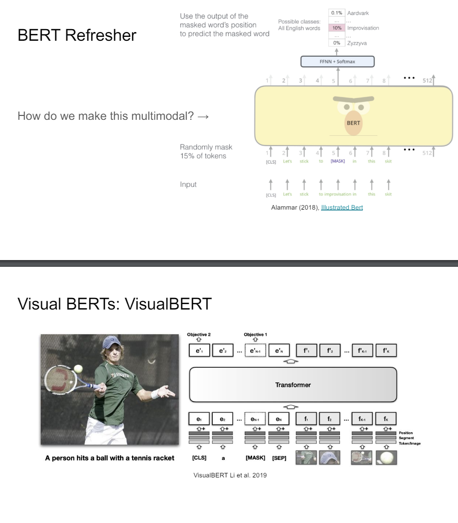 So the first thing is visual BERT. This was one of the very early ones where you have this image and people would do object detection on this. So you get lke a hat and a racket and a shirt and things like that. So you can just really take these features and then plug them into your transformer model and then you try to recover the features.