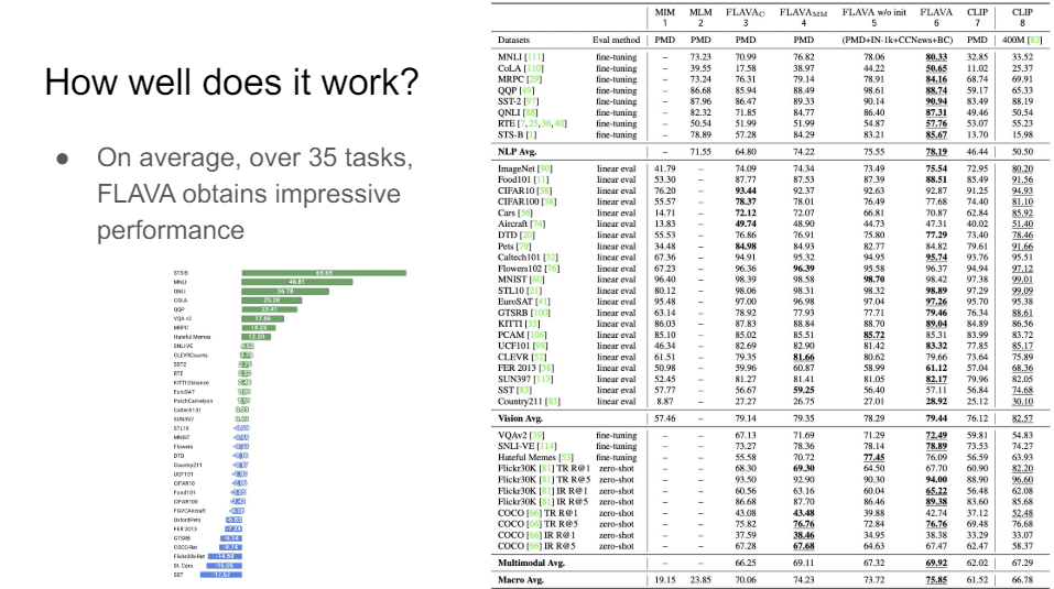When you do that, you get something that can really do a lot of things very well. Over 35 different tasks if you compare FLAVA to all kinds of different ablations in terms fo CLIP models, then this is just a much better way to get to this information.