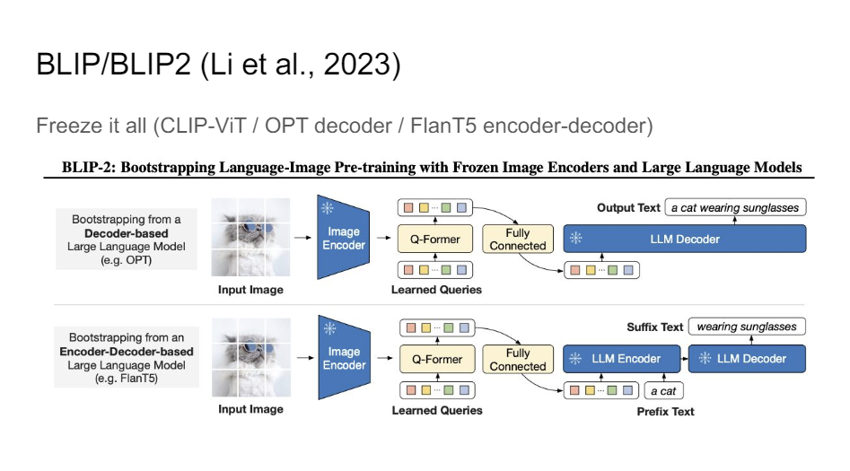 And then so in Flamingo, you still have a lot of moving parts, but you can really take this almost to the full extreme where you try to freeze almost everything. And you just want to learn this kind of mapping between your image encoder and your language model, or your image encoder and your encoder-decoder architecture, and all you really do is just the projections between the two.