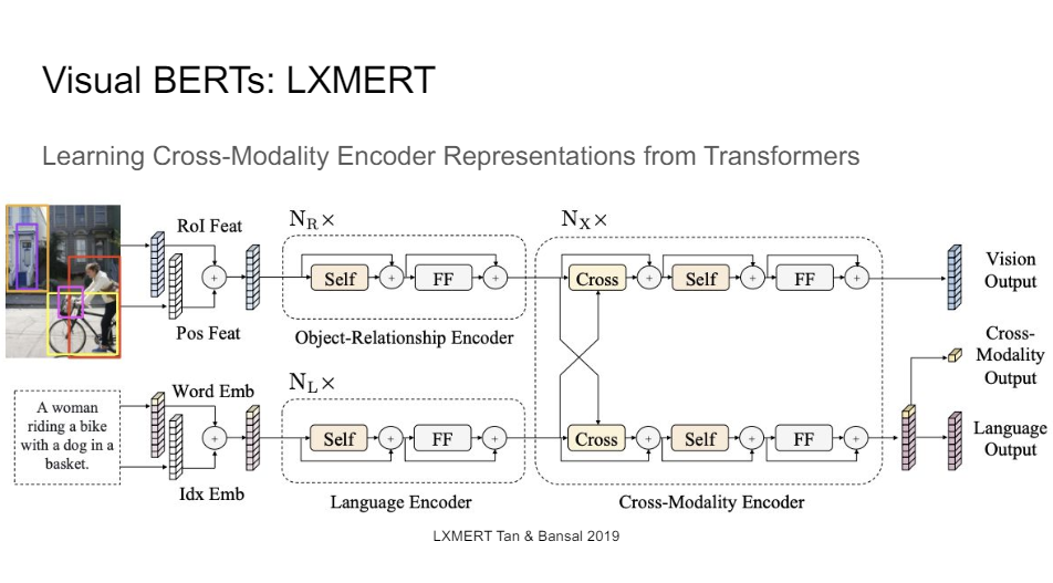 There's also LXMERT. There are like 100 papers that came out that did this all at the same time. So LXMERT had a different cross-modal output encoder, a bunch of different ways of encoding the positional information. So you could say, OK, I just have a bunch of bounding boxes that are featurized but I don't care about where they are in the image. So it's just a bag of bounding boxes. Or you could say, I found it here like this is the particular top left and bottom right coordinate and that's what you featurize into your network.