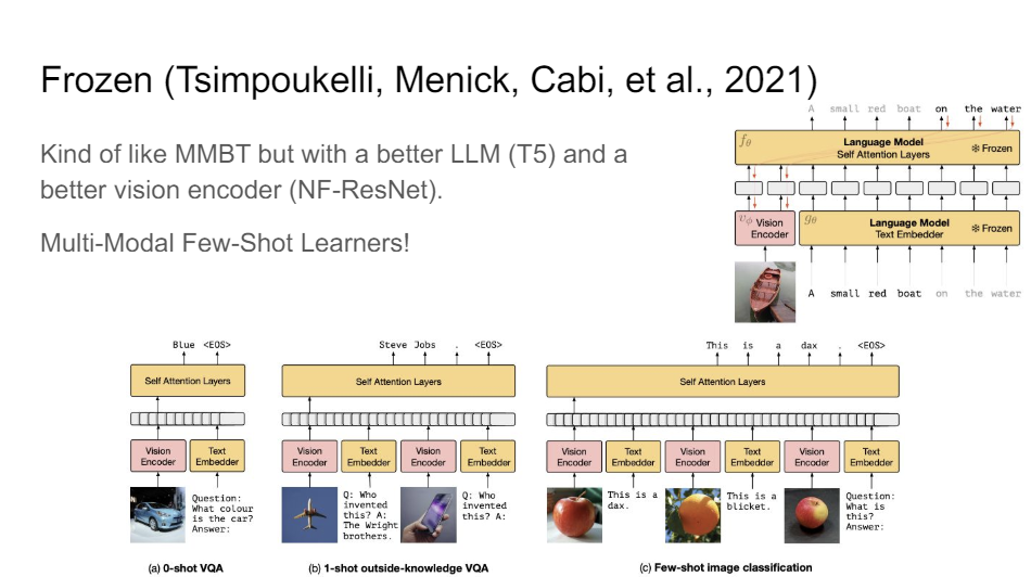 And so right now we're really in the age of language models. So one of the interesting things you can do with language models is just keep them frozen and then lean how to project into the language models. So the MMBT architecture I talked about where we had this BERT model, we kept it frozen, and we learn to project into the BERT token space.
