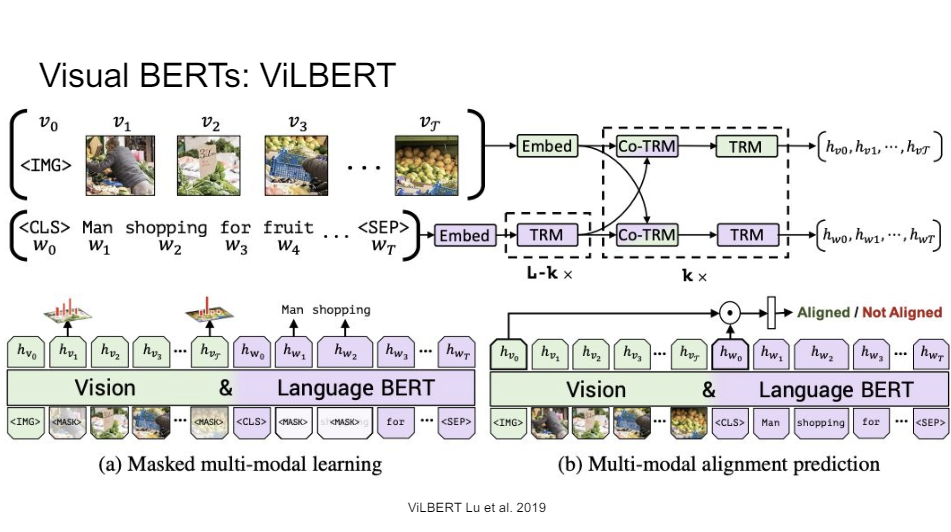 So this, you can train just like your regular BERT. So you have your masked language model here and you do some equivalent of that. And then you also have your next sentence prediction, but instead, here, we're saying, OK, is this image aligned with this piece of text or not?