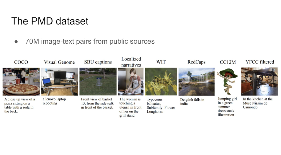 Unfortunately, the CLIP data and the Google align data and all of these data sets, they haven't been open source. So this is before LAION. So now there's a good alternative to this. But so this PMD data set, if you combine all of these image text pairs, you get 70 million of them. So that's still a pretty decent size.