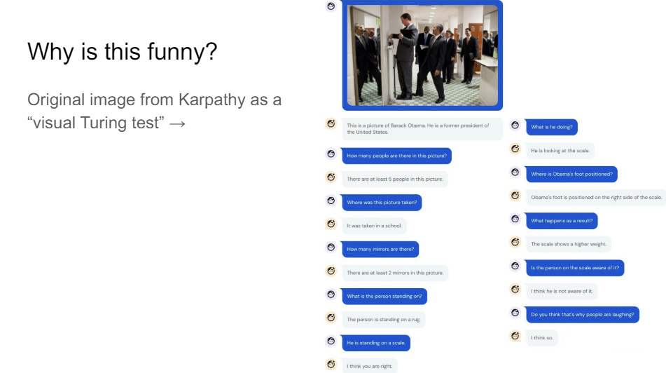 So Karpathy, I think, more than 10 years ago had this image. It's Barack Obama setting his foot here on the scale to make somebody think they're a lot heavier than they really are. So this is obviously funny to us, nt not to an AI system, I think, unless it really understands the scene. And so that's why Karpathy at the time said this would be a really good visual Turing test. If a system can figure this out, then it's actually really samrt. And so obviously, it's been a bit of a challenge for everybody working in the field than to get something that actually works on this.